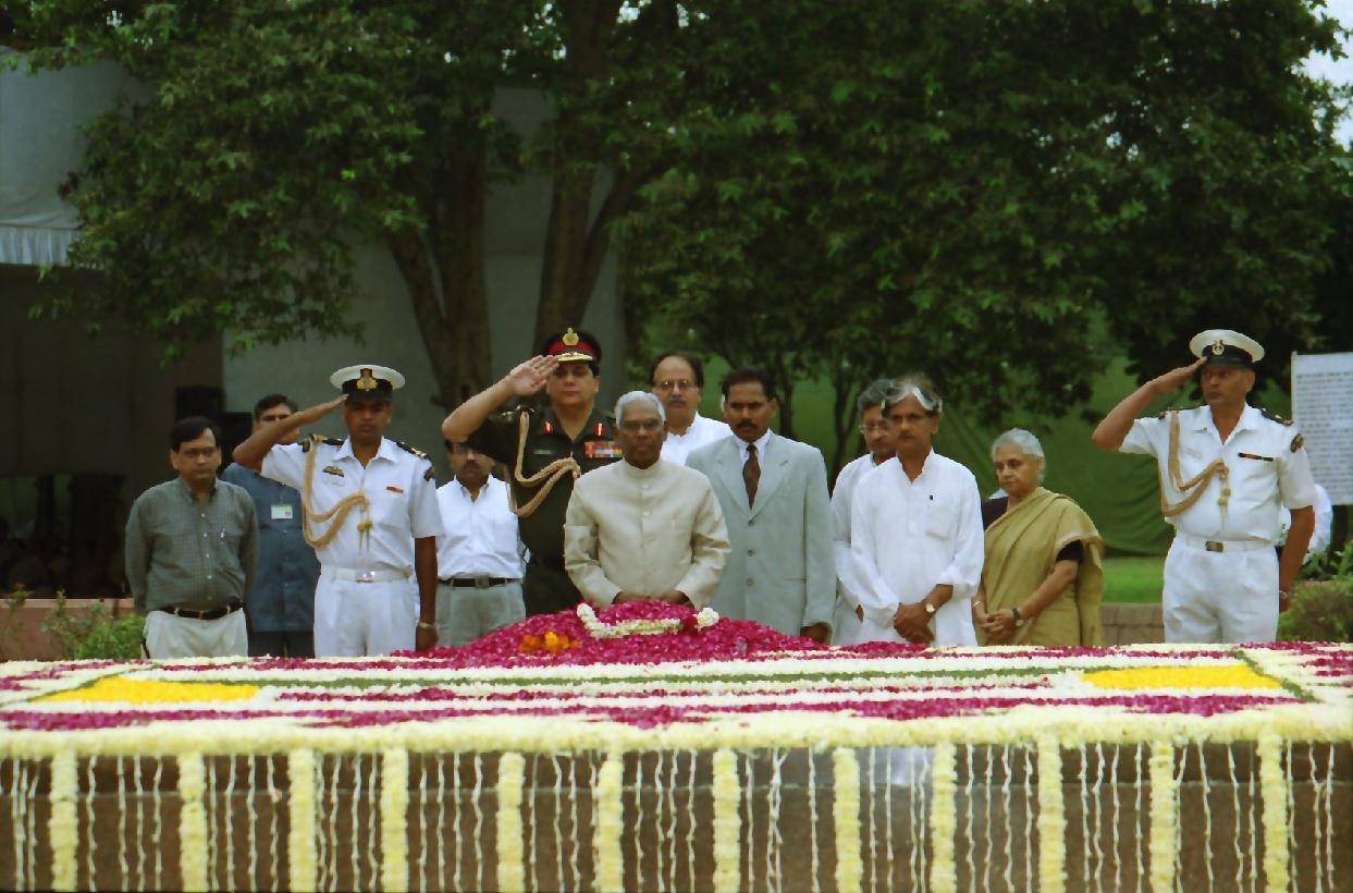 The President of India, Shri K R Narayanan paying homage at the Samadhi of the Former Prime Minister of India, Late Shri Lal Bahadur Shastri on the occasion of his Birth Anniversary at Vijay Ghat in New Delhi on Oct 02, 2001