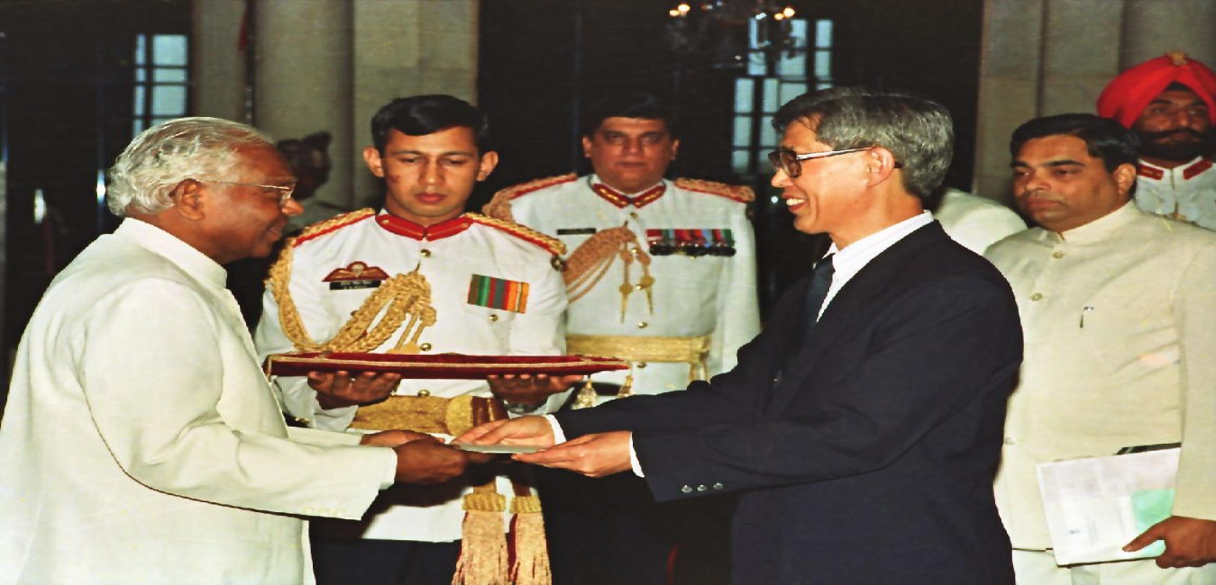 The Ambassador-Designate of the Peoples Republic of China to India, His Excellency Mr Zhou Gang presenting his credentials to the President of India, Shri K R Narayanan at Rashtrapati Bhavan in New Delhi on June 01, 1998