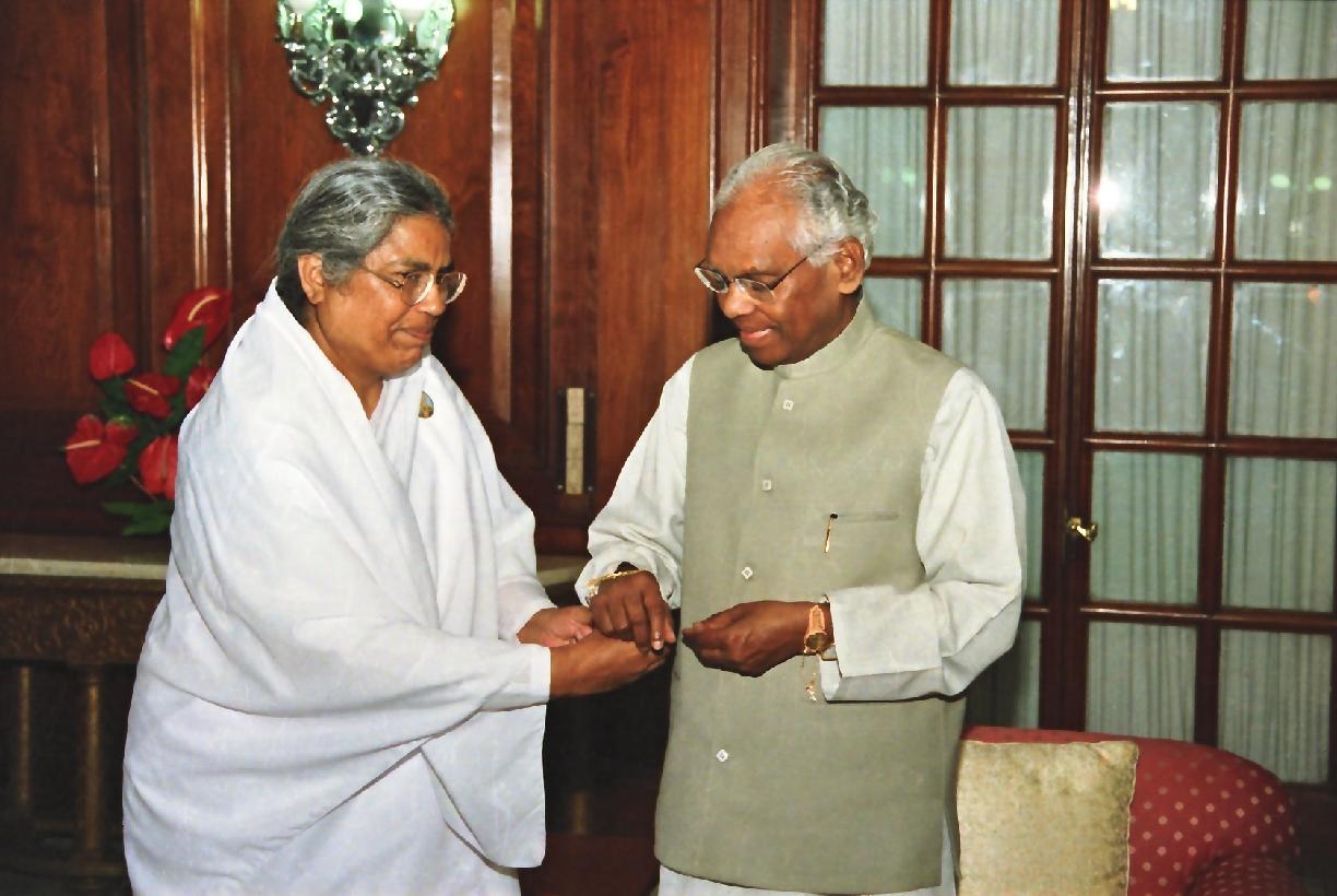 The President of India, Shri K R Narayanan receiving greetings on the occasion of Raksha Bandhan (tying of RAKHI) at the Committee Room of Rashtrapati Bhavan in New Delhi on Aug 26, 1999