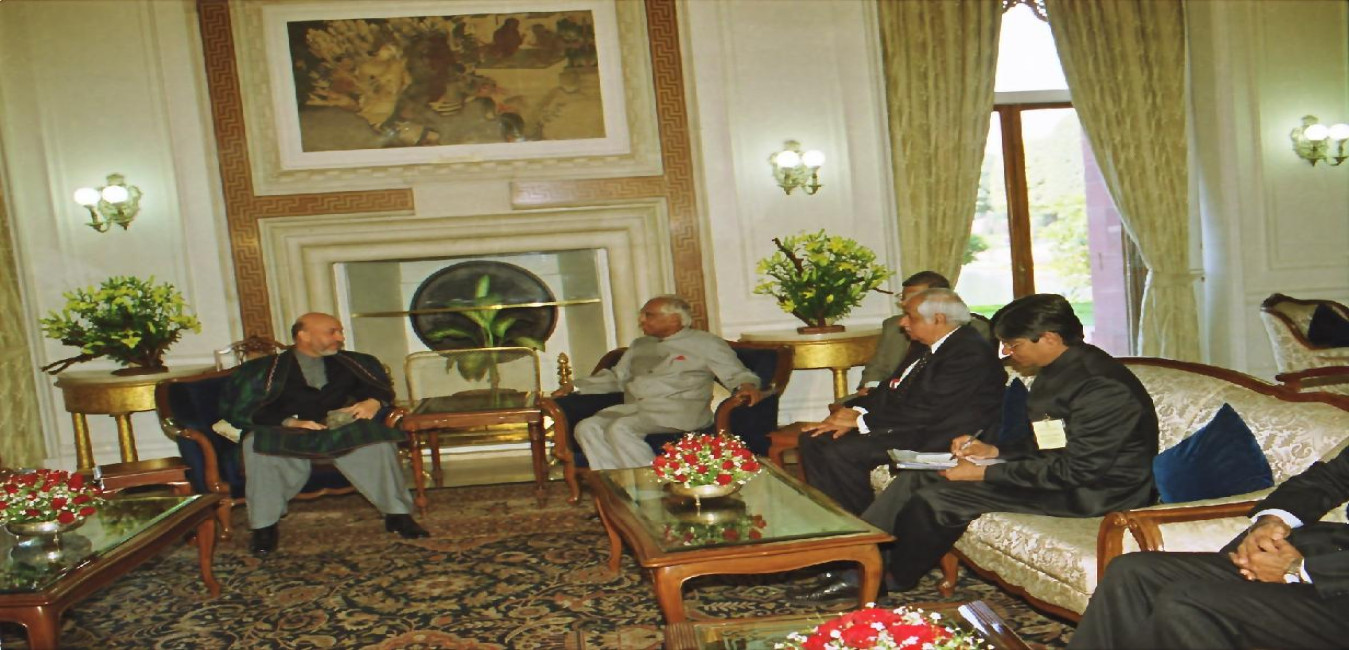 The Chairman of the Interim Administration of Afghanistan, His Excellency Mr Hamid Karzai calling on the President of India, Shri K R Narayanan at the Morning Room of Rashtrapati Bhavan in New Delhi on Feb 27, 2002