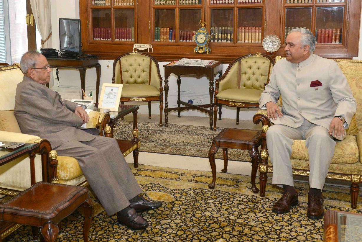 The President of India, Shri Pranab Mukherjee meeting with the Governor of Mizoram, Lt. Gen. (Retd) Nirbhay Sharma, at Rashtrapati Bhavan, in New Delhi on August 27, 2015.