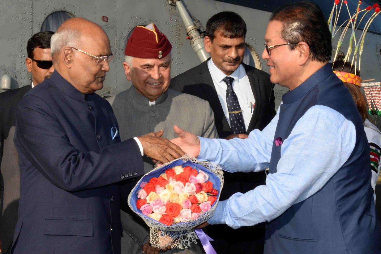 The President of India, Shri Ram Nath Kovind being received by the Mizoram Governor, Lt. General (Retd) Nirbhay Sharma and the Mizoram Chief Minister, Shri Lal Thanhawla, on his arrival, at Lengpui Airport, in Aizawl, Mizoram on November 29, 2017.