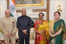 The former Governor of Arunachal Pradesh and Mizoram, Lt. Gen. Nirbhay Sharma (Retd.) along with his wife Smt. Jyotsana Sharma meeting with the President of India, Shri Ram Nath Kovind and the First Lady Smt. Savita Kovind, at Rashtrapati Bhavan on March 07, 2020.