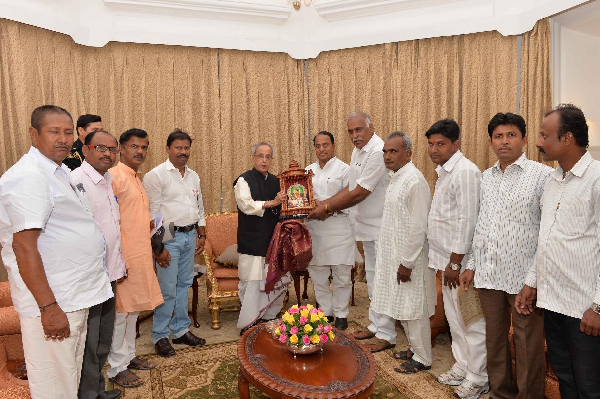 The President of India, Shri Pranab Mukherjee meeting with the Minister for Housing Law & Endowments, Govt.of Telangana, Shri A. Indrakaran Reddy and others, at Rashtrapati Nilayam, Bolarum, in Secunderabad on July 06, 2015.