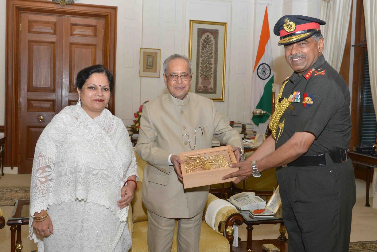 The President of India, Shri Pranab Mukherjee meeting with Lt. Gen. A.K. Misra, AVSM, ADC, Commandant, School of Arty & Hony ADC to President and Smt. Meena Misra, at Rashtrapati Bhavan, in New Delhi on August 27, 2015.