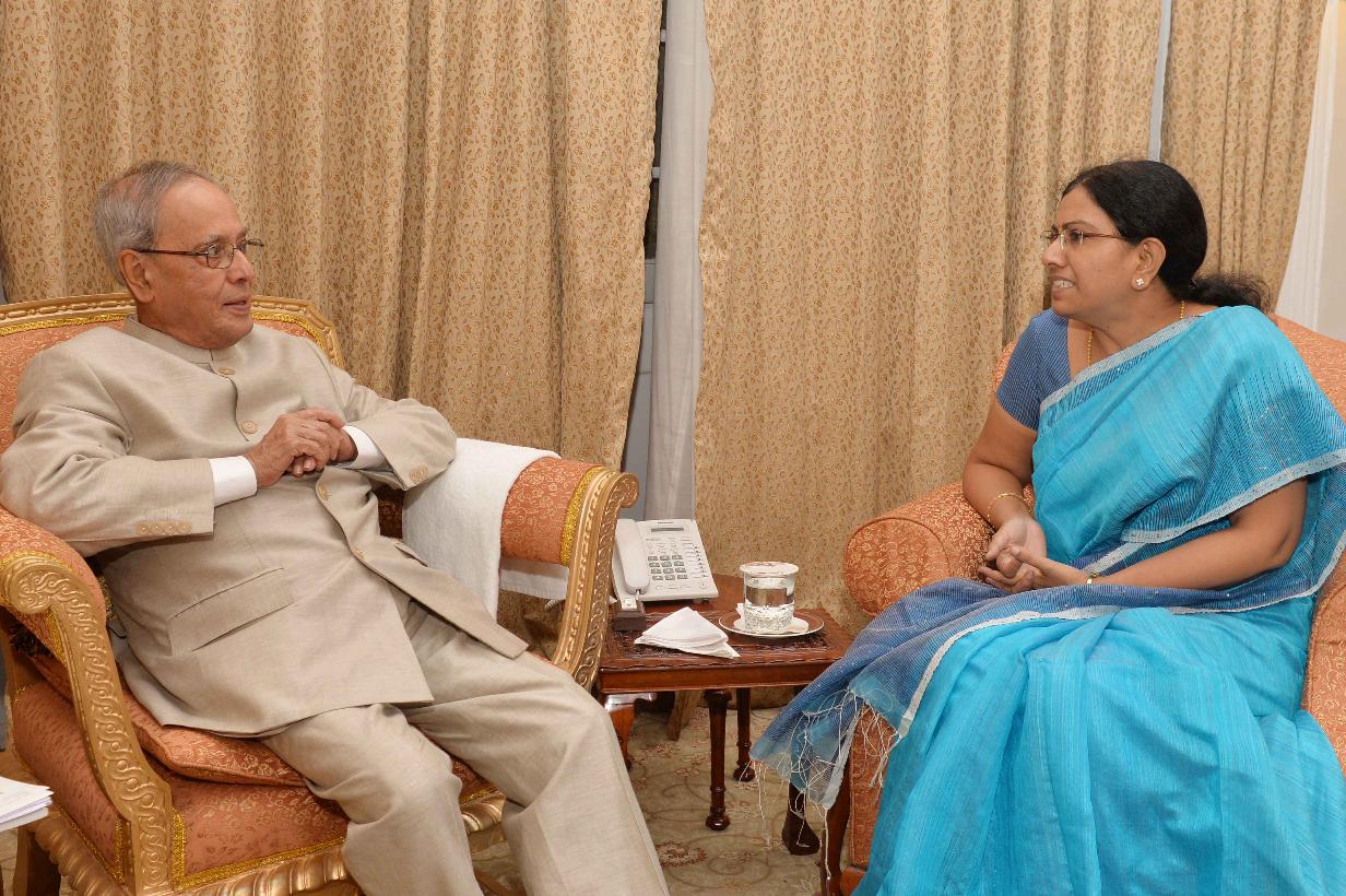 The President of India, Shri Pranab Mukherjee meeting with Smt. A.R. Anuradha, at Rashtrapati Nilayam, Bolarum, in Secunderabad on July 04, 2015.