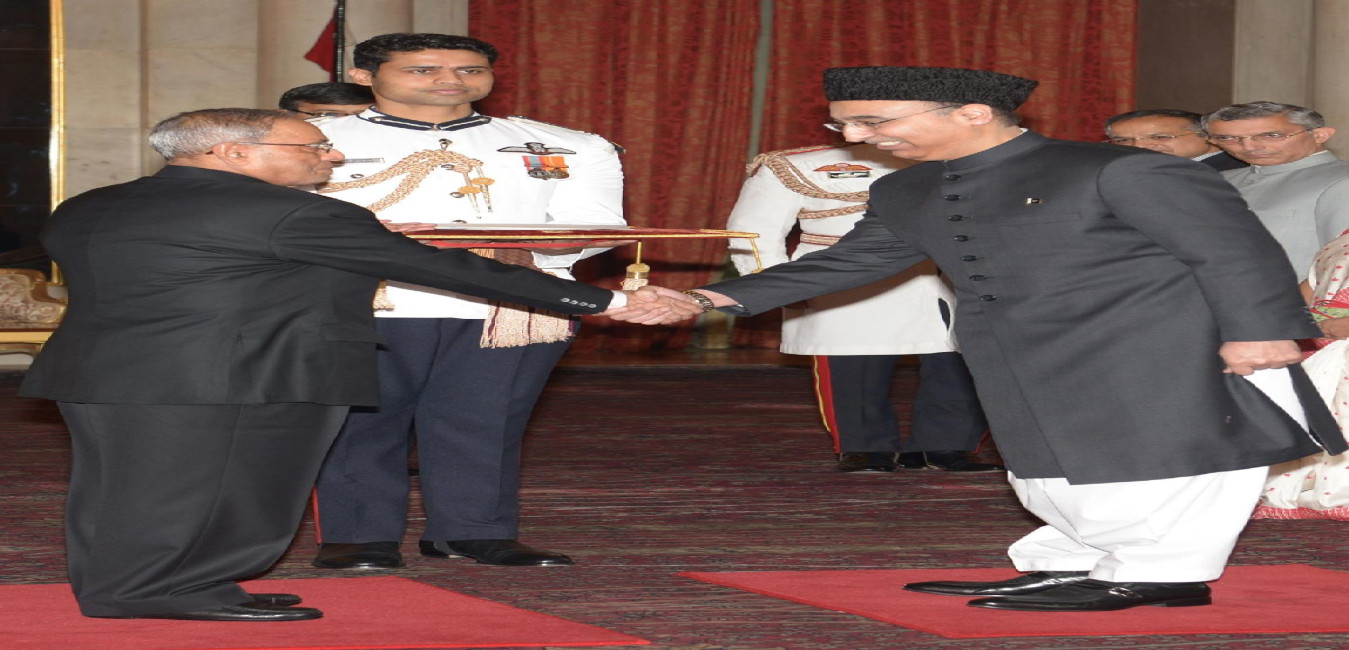 The High Commissioner of Pakistan, His Excellency Mr Abdul Basit presenting his credentials to the President of India, Shri Pranab Mukherjee at Rashtrapati Bhavan in New Delhi on April 02, 2014