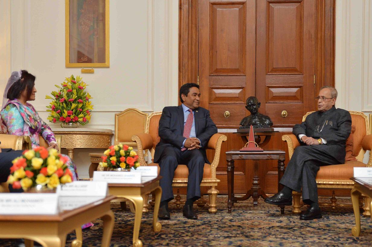 The President of India, Shri Pranab Mukherjee meeting with the President of the Republic of Maldives, HE Mr Abdulla Yameen Abdul Gayoom at Rashtrapati Bhavan in New Delhi on May 27, 2014