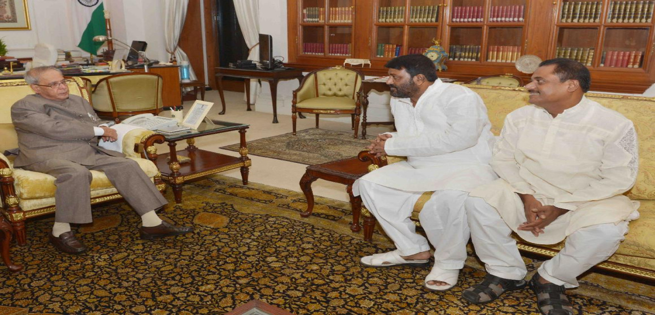 The President of India, Shri Pranab Mukherjee meeting with Shri Abu tahir Khan, MLA and Shri Azam Khan from Murshidabad, at Rashtrapati Bhavan, in New Delhi on September 04, 2015.