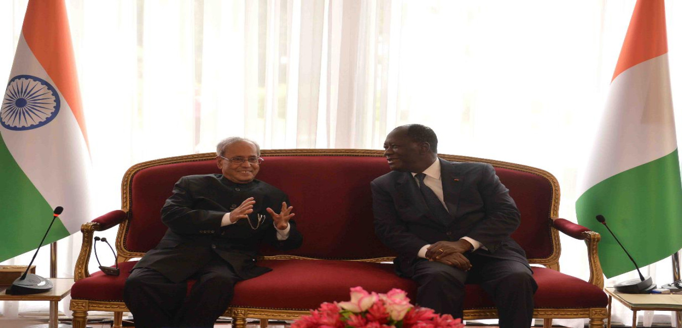 The President of India, Shri Pranab Mukherjee with the President of the Republic of Cote d lvoire, H.E. Mr. Alassane Ouattara during Delegation Level Talks, at Presidential Palace, in Abidjan, Republic of Cote d lvoire on June 14, 2016.