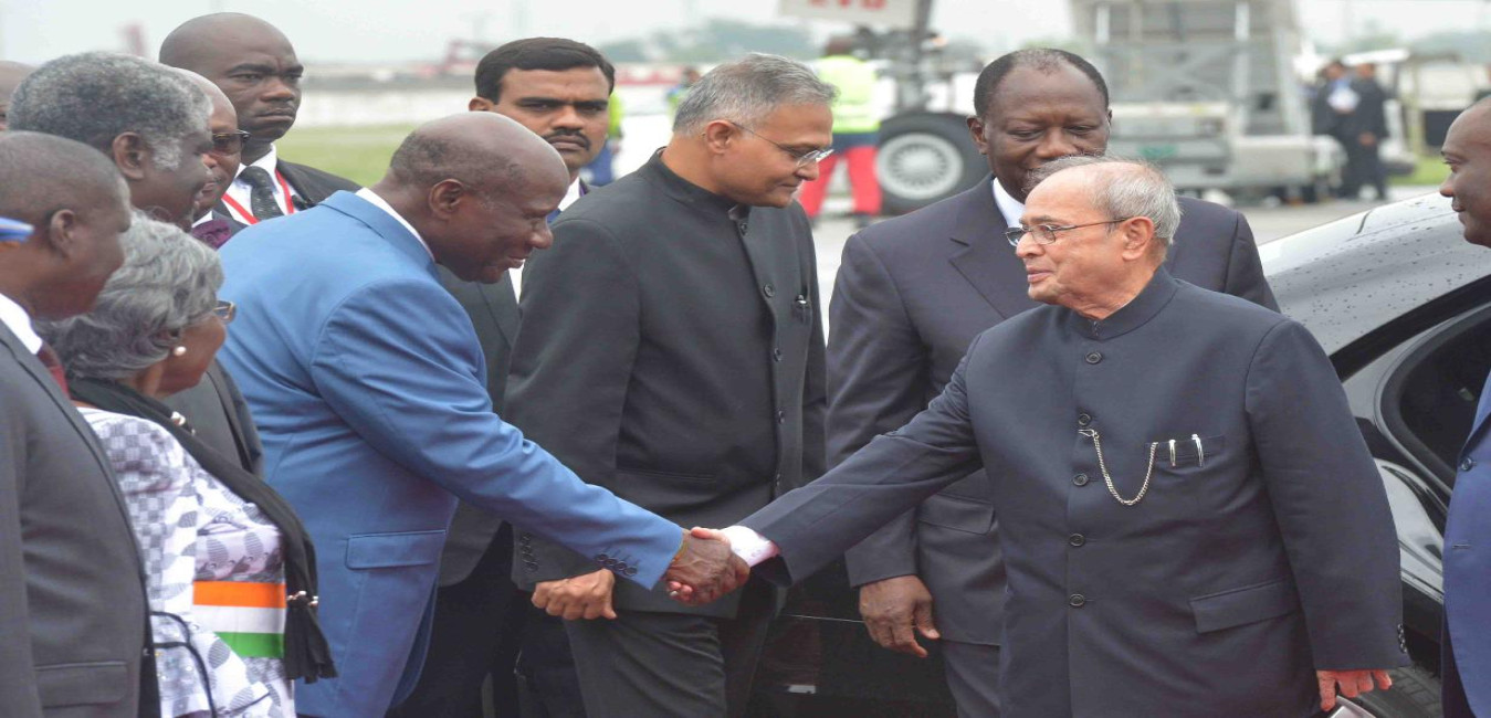 The President of India, Shri Pranab Mukherjee being received by the President of the Republic of Cote d lvoire, H.E. Mr. Alassane Ouattara, on his arrival, at Abidjan International Airport, in Republic of Cote d lvoire on June 14, 2016.