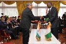 The President of the Republic of Cote d lvoire, H.E. Mr. Alassane Ouattara presenting the highest national honour, the Grande Croix Commandeur in National Merit Order to the President of India, Shri Pranab Mukherjee, during Banquet at Presidential Palace, in Abidjan, Republic of Cote d lvoire on June 14, 2016.