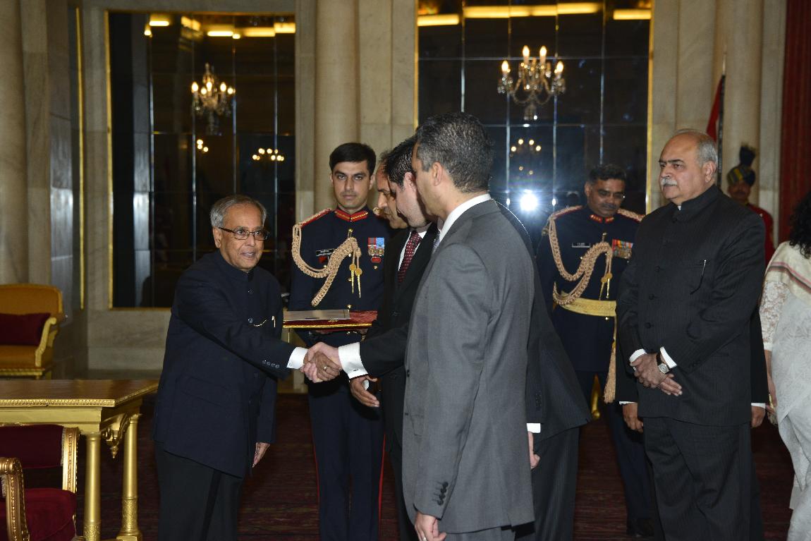 HE Mr Ali Abd-Al-Aziz-Isawi, from Ambassador-Designate of State of Libya presenting his credentials to The President of India, Shri Pranab Mukherjee at Rashtrapati Bhavan on Jan 22,2013