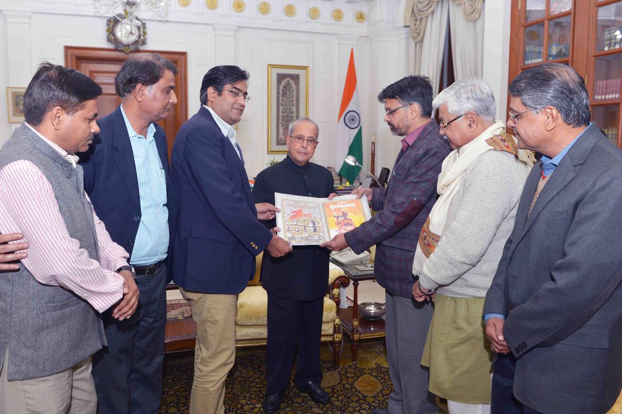 The President of India, Shri Pranab Mukherjee being presented the commemorative volumes of the Panchjanya and Organiser by Shri Alok Kumar, Sah Prant Sanghchalak, Rashtriya Swayamsewak Sangh with others, at Rashtrapati Bhavan on January 03, 2017.
