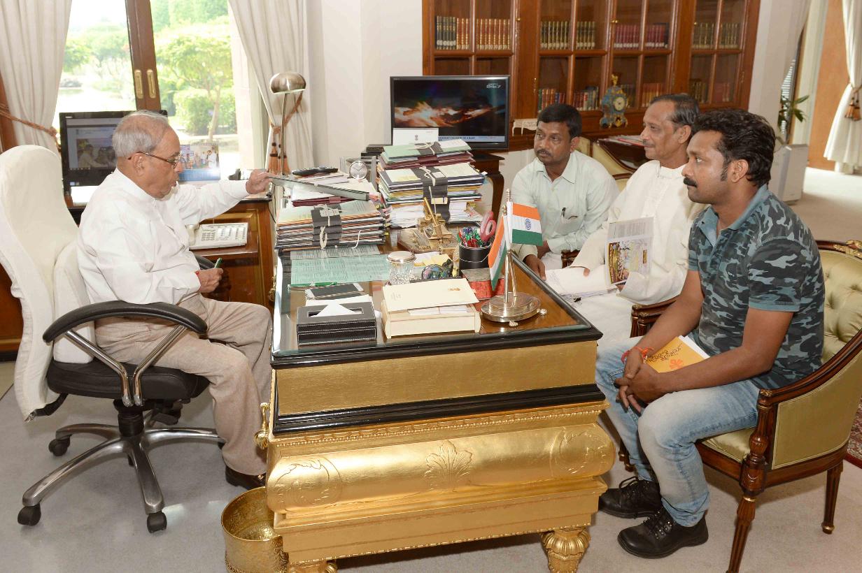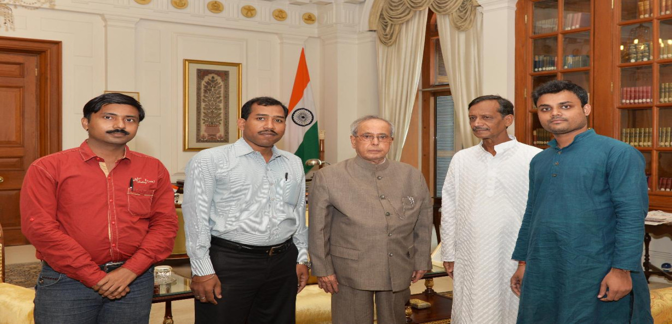 The President of India, Shri Pranab Mukherjee meeting with Shri Aloke Nandi alongwith Shri Sabyosachi Pal, Shri Tarak Ojha and Shri Ramkrishna Shit from Dantan, Paschim Medinipur, at Rashtrapati Bhavan, in New Delhi on September 26, 2015.