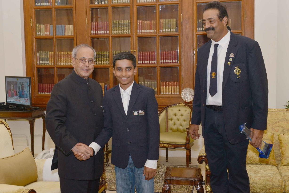 The President of India, Shri Pranab Mukherjee meeting with Shri Amit Luthra, Founder & Chief Executive Officer, The Golf Foundation alongwith Master Shubham Jaglan, winner of the Junior World Golf Tournament, at Rashtrapati Bhavan, in New Delhi on November 09, 2015.