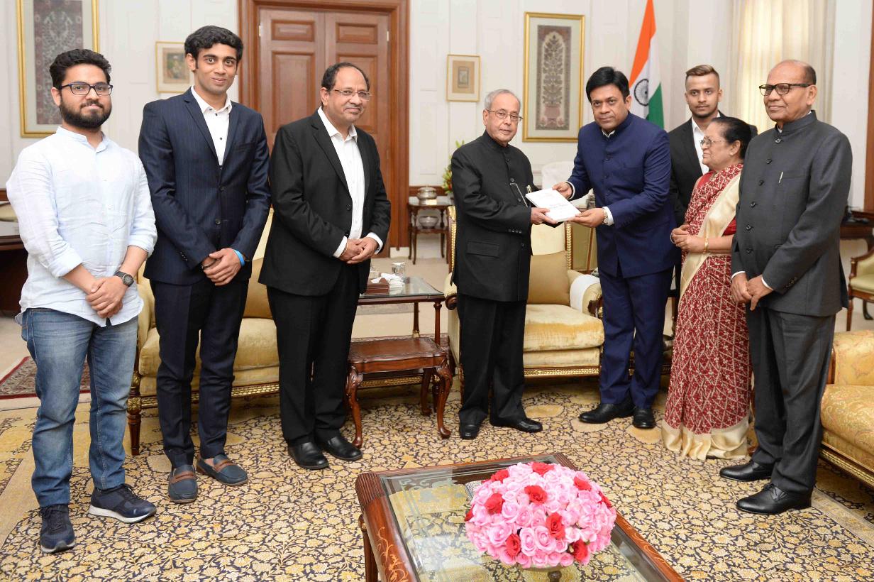 The President of India, Shri Pranab Mukherjee receiving a copy of the book ''Indian Foreign Trade-Trumped Up or Down'' from Shri Amiya Chandra with others, at Rashtrapati Bhavan on June 05, 2017.