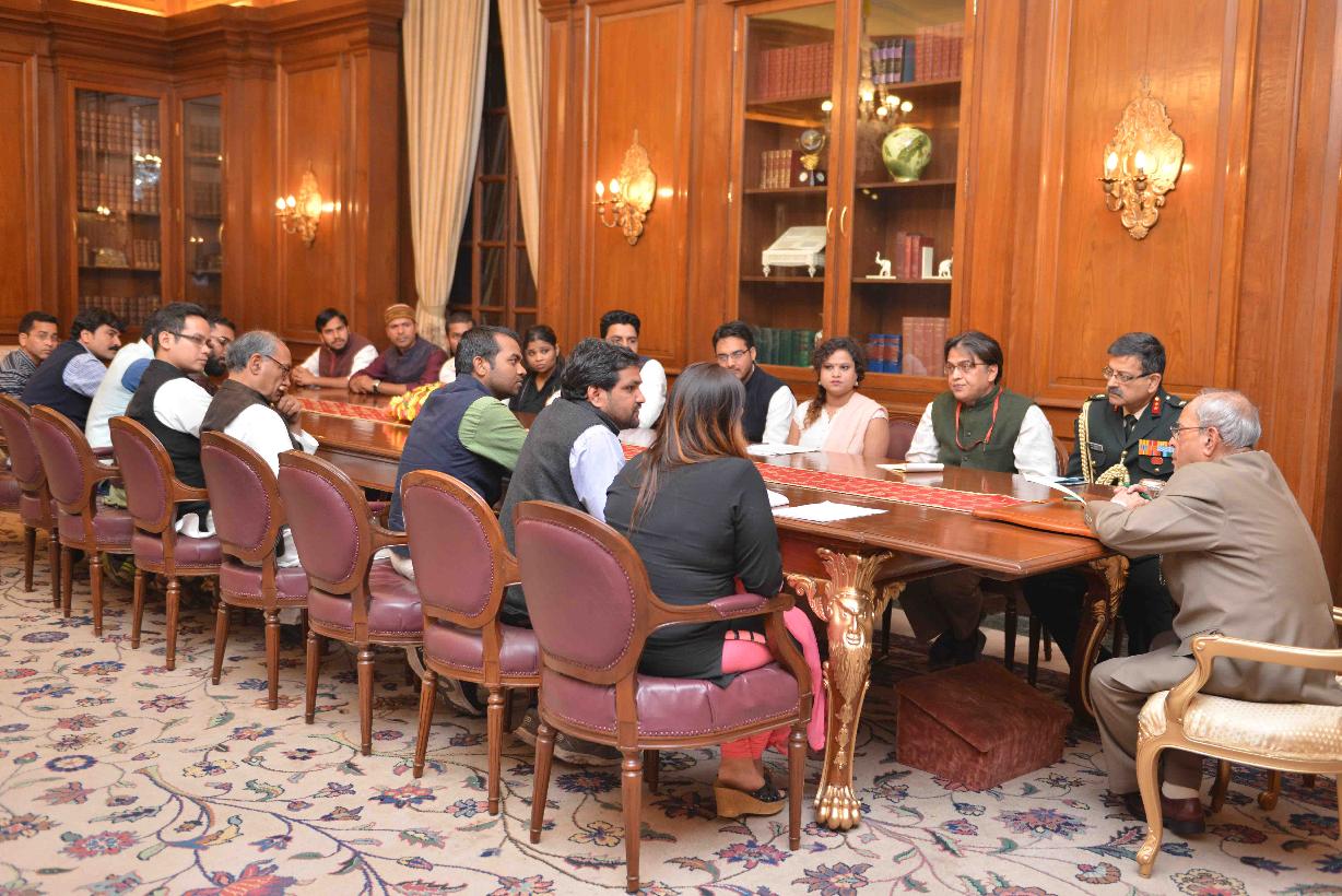 The President of India, Shri Pranab Mukherjee meeting with Ms. Amrita Dhawan, National President, National Students' Union of India (NSUI) alongwith a delegation comprising JNU & DU students and teachers, at Rashtrapati Bhavan on February 24, 2017.