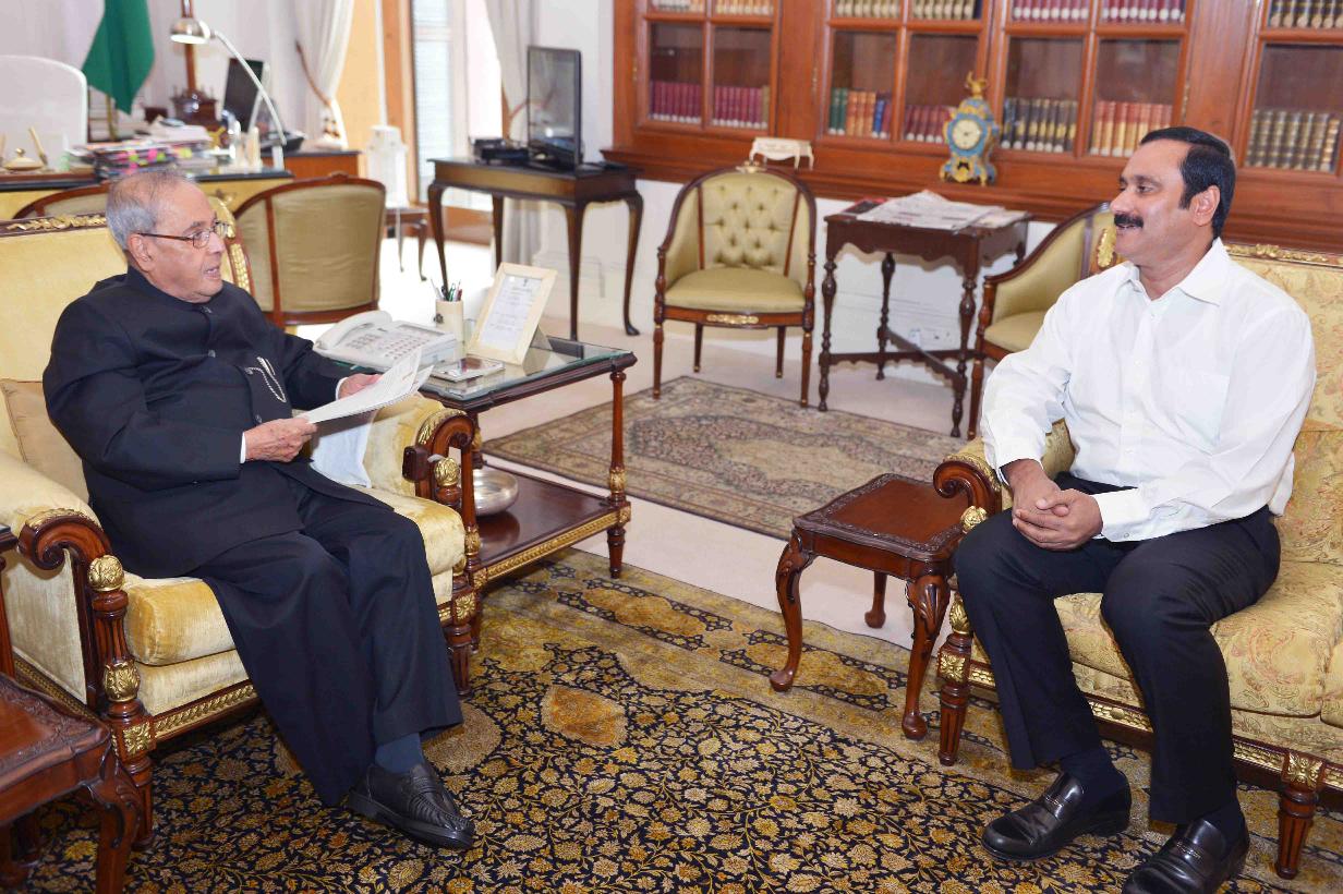 The President of India, Shri Pranab Mukherjee meeting with Dr. Anbumani Ramadoss, former Union Minister, at Rashtrapati Bhavan on September 15, 2016.