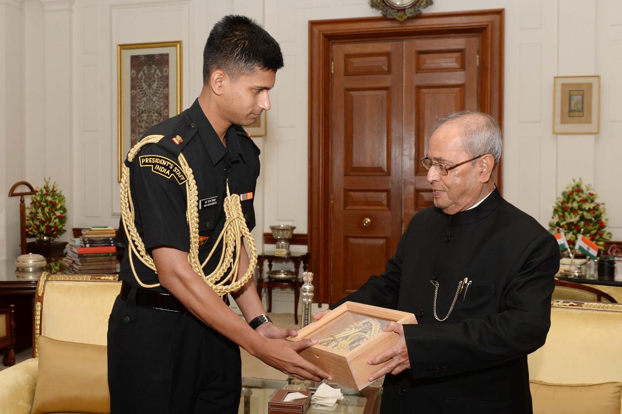 The President of India, Shri Pranab Mukherjee meeting with Capt. Arko Kiran Debnath, ADC to the President, at Rashtrapati Bhavan on June 23, 2017.