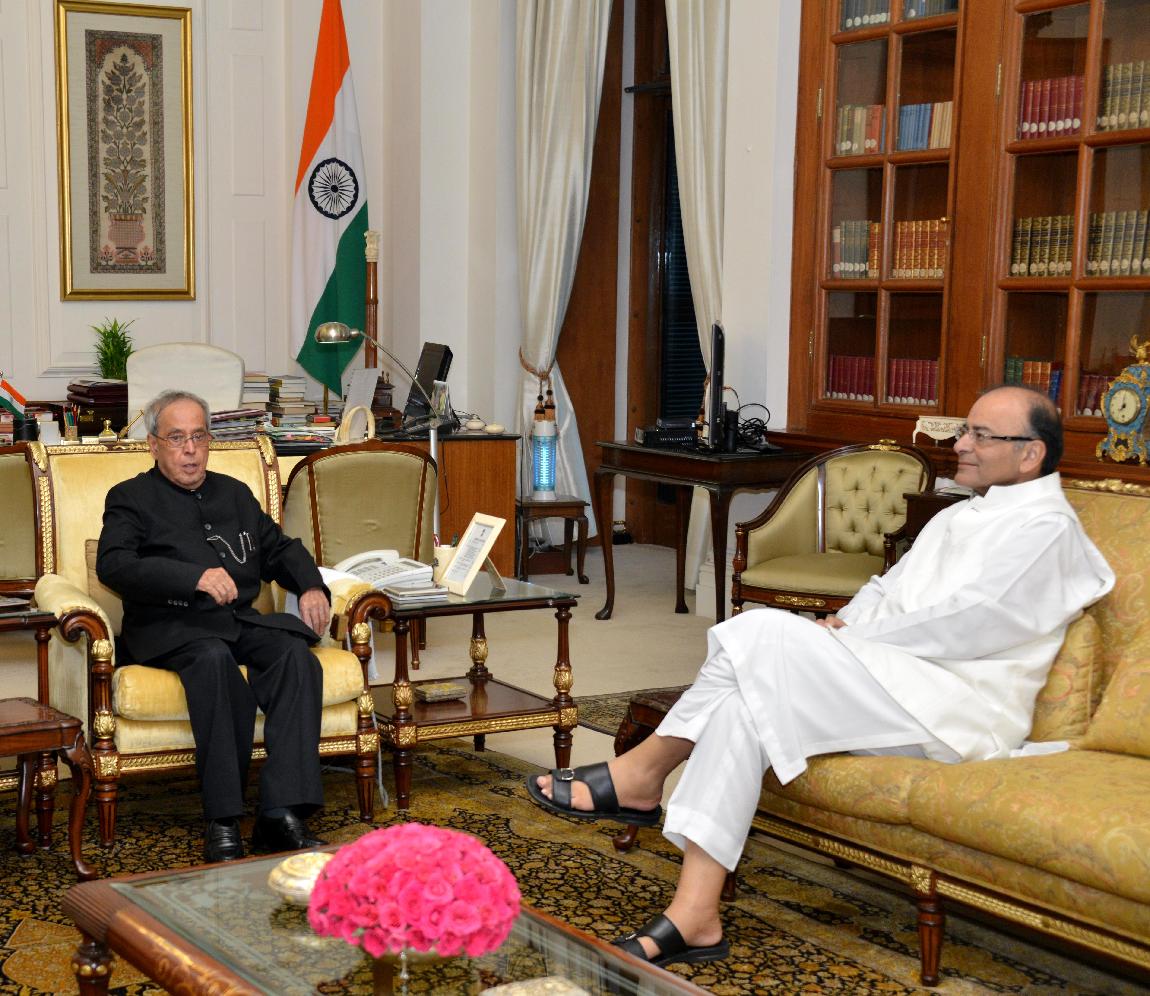 The President of India, Shri Pranab Mukherjee meeting with Shri Arun Jaitley, Minister of Finance, at Rashtrapati Bhavan, in New Delhi on August 19, 2015.