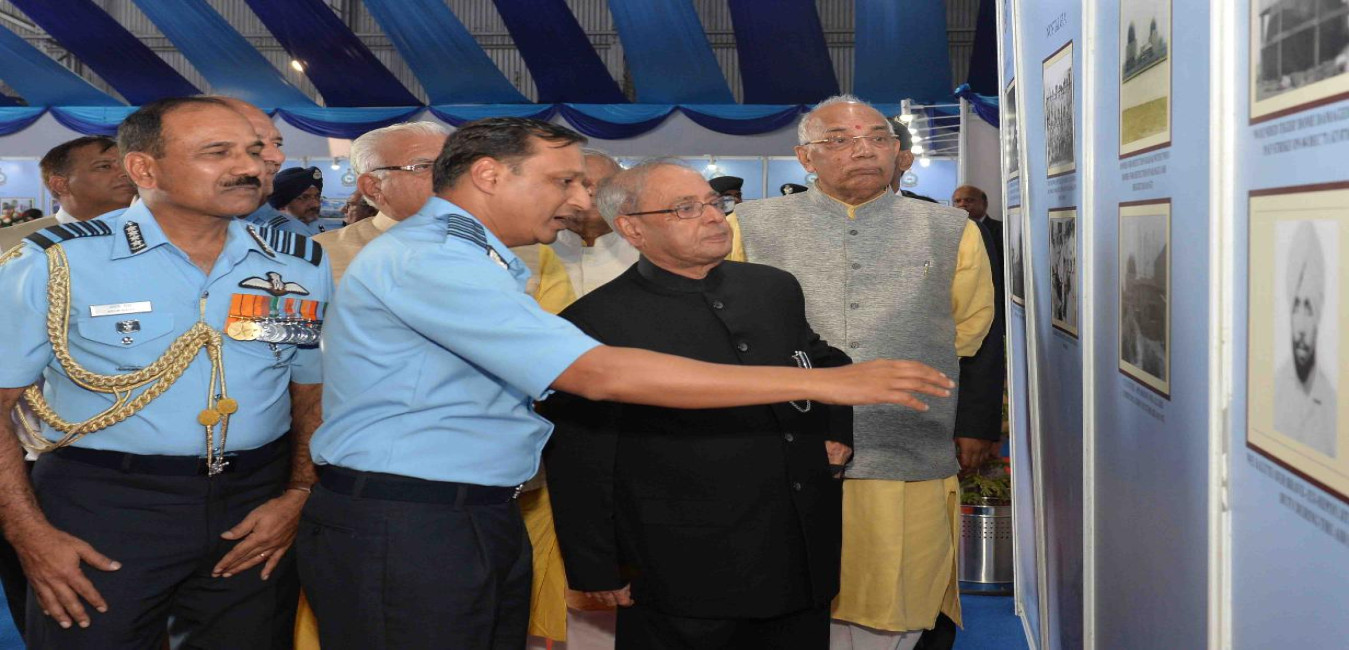 The President of India, Shri Pranab Mukherjee visiting photo exhibition, at the presentation of Standard to 501 Signal Unit and 30 Squadron of Indian Air Force, at Air Force Station Ambala, in Haryana on November 10, 2016.