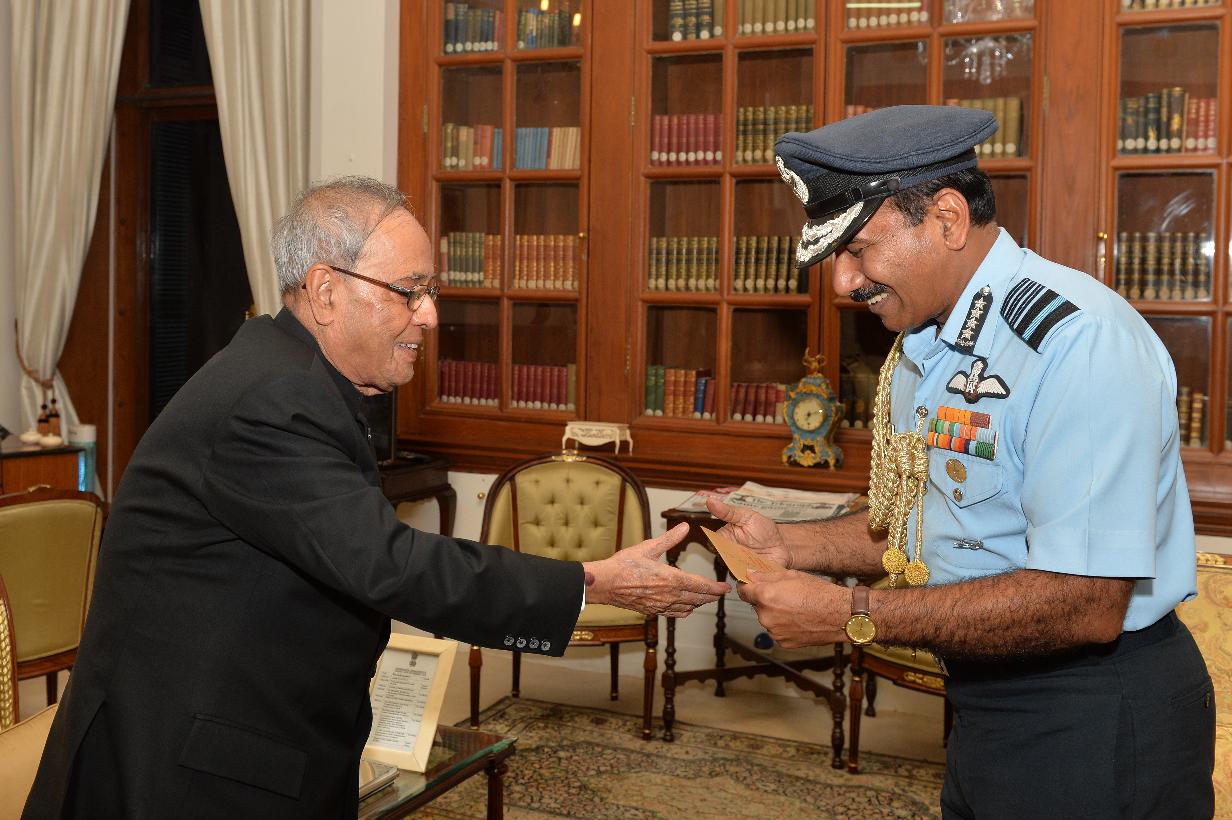 The President of India, Shri Pranab Mukherjee meeting with the Chief of Air Staff, Air Chief Marshal Arup Raha, at Rashtrapati Bhavan, in New Delhi on August 25, 2015.