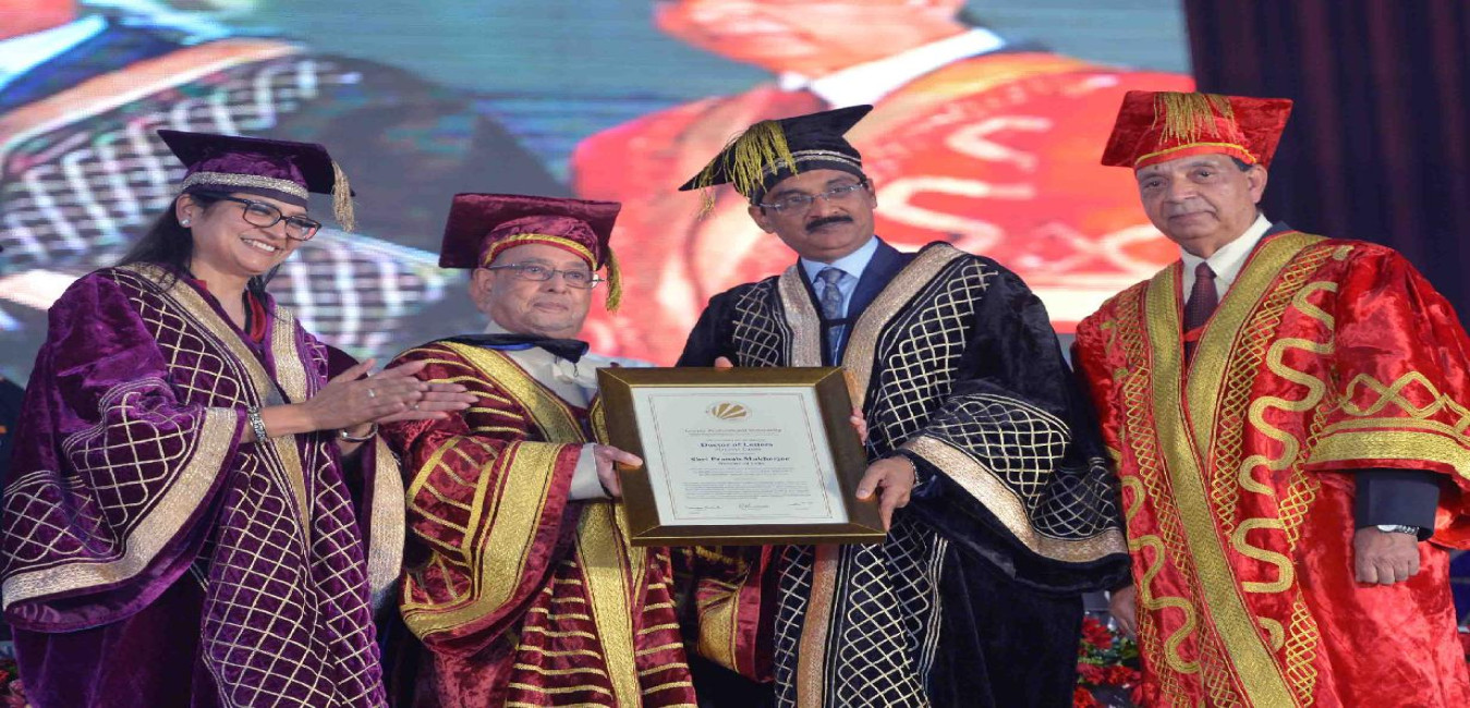 The President of India, Shri Pranab Mukherjee being conferred the Doctorate Honoris Causa Degree by the Chancellor of Lovely Professional University (LPU), Shri Ashok Kumar Mittal, at the 8th Convocation of LPU, at Phagwara, in Punjab on May 02, 2017.