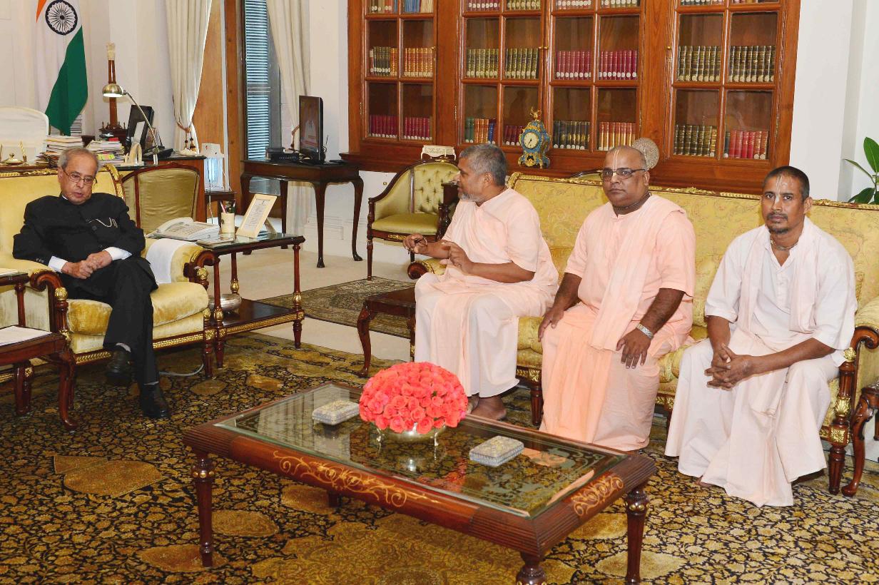 The President of India, Shri Pranab Mukherjee meeting with BS Sanyasi Maharaj, Secretary and others from Gaudiya Mission, Kolkata, at Rashtrapati Bhavan on July 19, 2016.