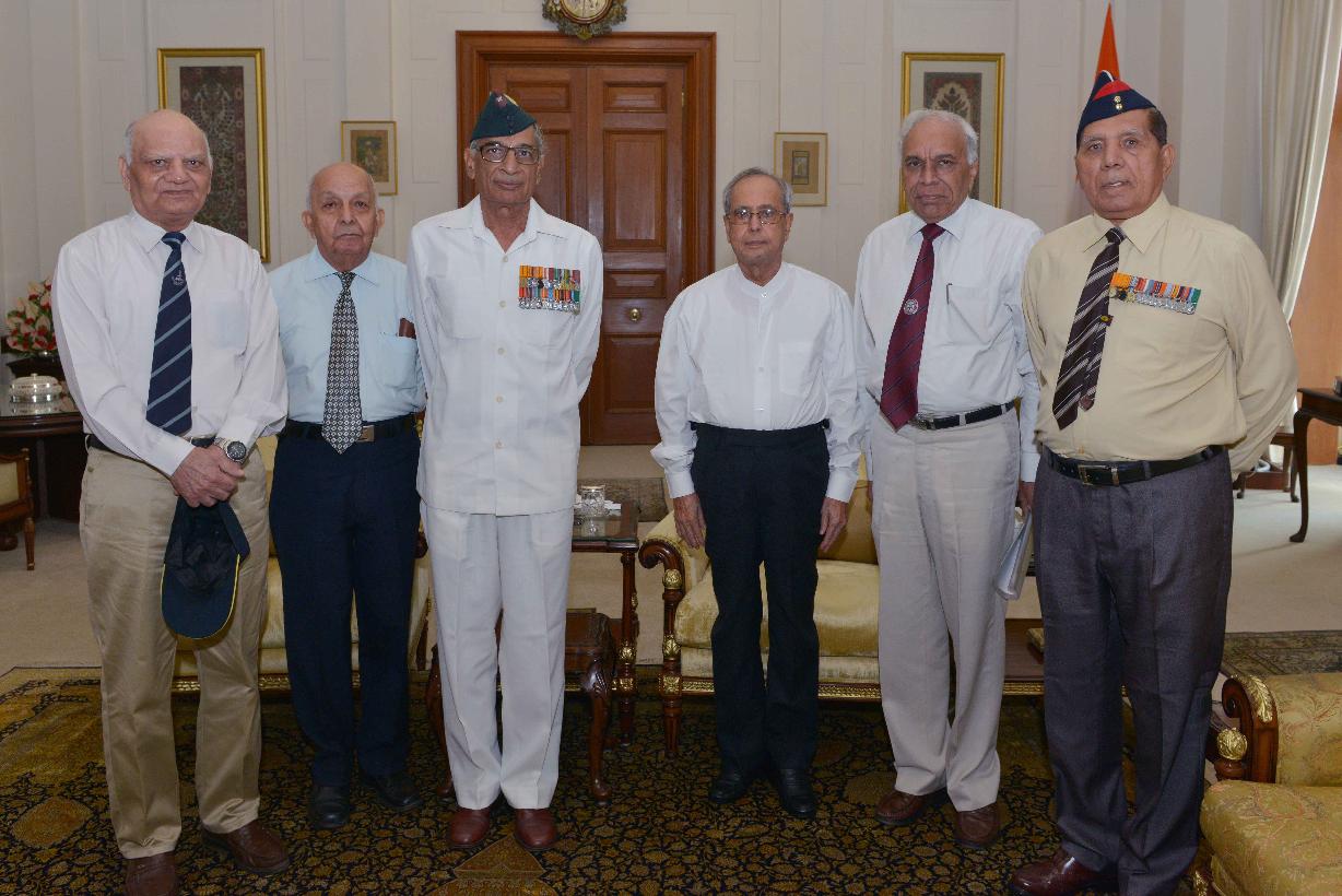 The President of India, Shri Pranab Mukherjee meeting with Lt. Gen. Retd. (Dr.) Balbir Singh, President, Indian Ex-Services League and others on the occasion of 'Armed Forces Veterans Week', at Rashtrapati Bhavan, in New Delhi on September 25, 2015.
