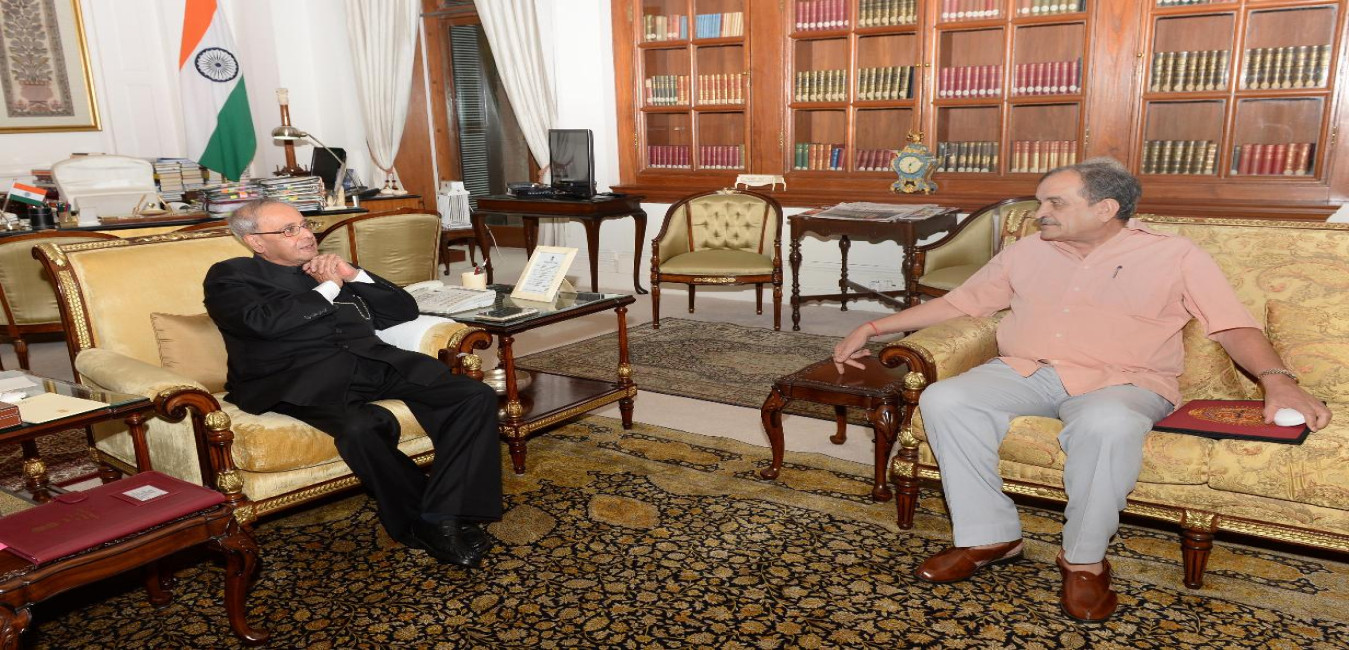 The President of India, Shri Pranab Mukherjee meeting with Chaudhary Birender Singh, Minister of Rural Development, Panchayati Raj and Drinking Water & Sanitation, at Rashtrapati Bhavan on June 25, 2016.