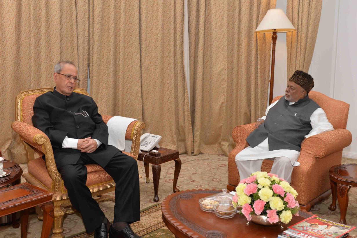 The President of India, Shri Pranab Mukherjee meeting the former Union Minister of Railways, Shri C.K. Jaffer Sharief, at Rashtrapati Bhavan, in New Delhi on July 13, 2015.