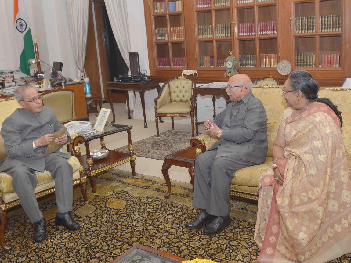 The President of India, Shri Pranab Mukherjee meeting with the former Chairman, MMTC, Shri C.R. Das alongwith his daughter Smt. Rita Bose, at Rashtrapati Bhavan on November 16, 2015.