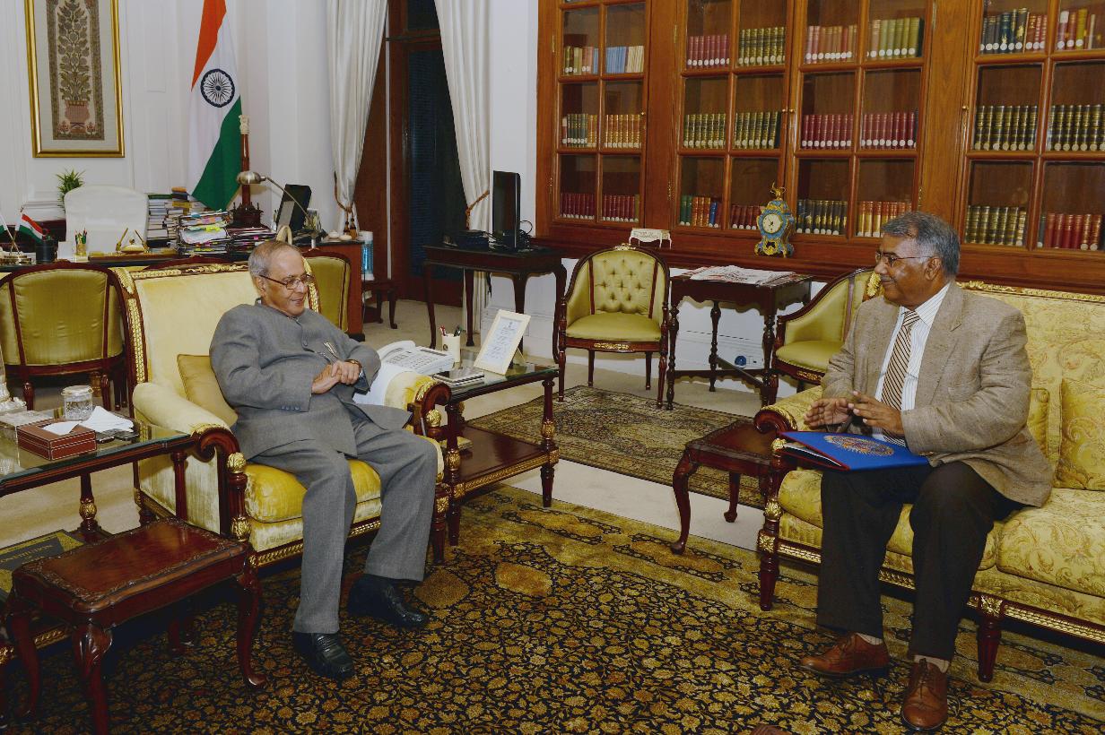 The President of India, Shri Pranab Mukherjee meeting the Chairman, Press Council of India, Shri Justice Chandramauli Kumar Prasad, at Rashtrapati Bhavan, in New Delhi on August 12, 2015.