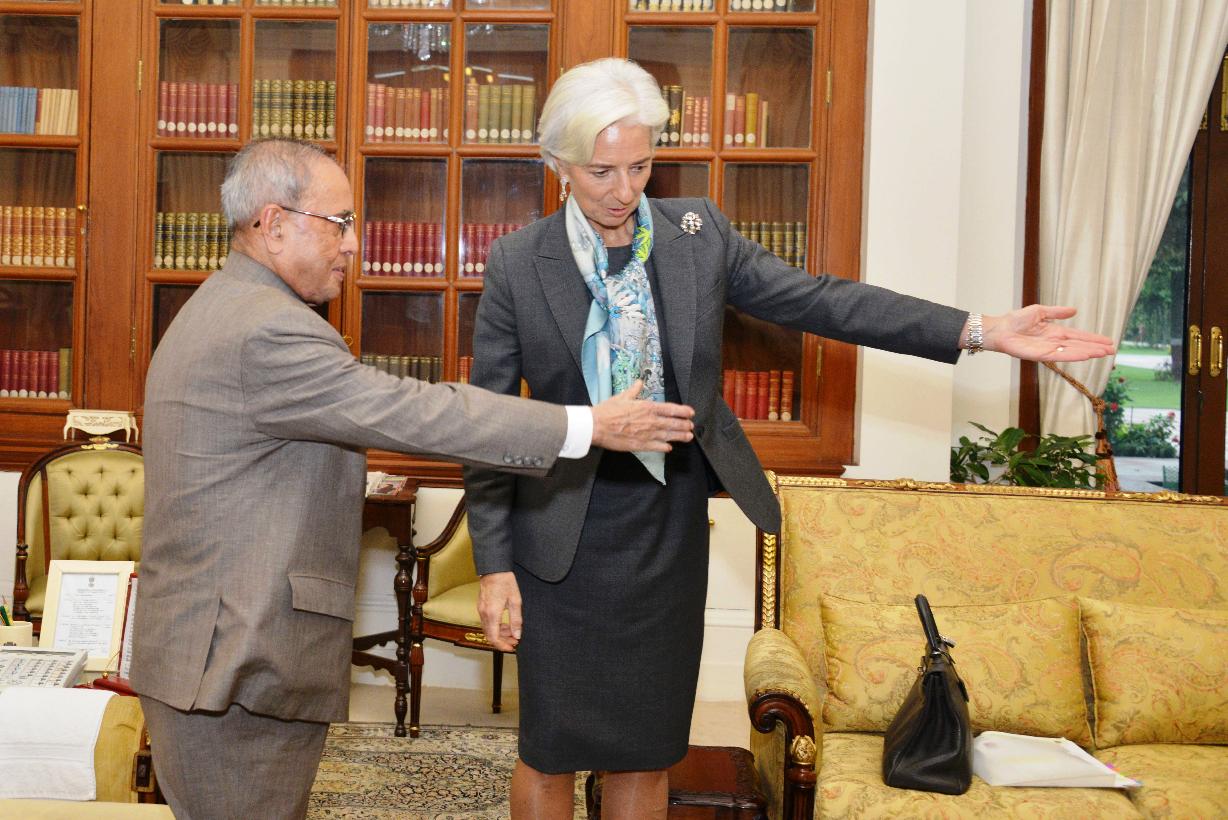 The Managing Director of the International Monetary Fund (IMF), Ms. Christine Lagarde calling on the President of India, Shri Pranab Mukherjee, at Rashtrapati Bhavan, in New Delhi on March 16, 2015.
