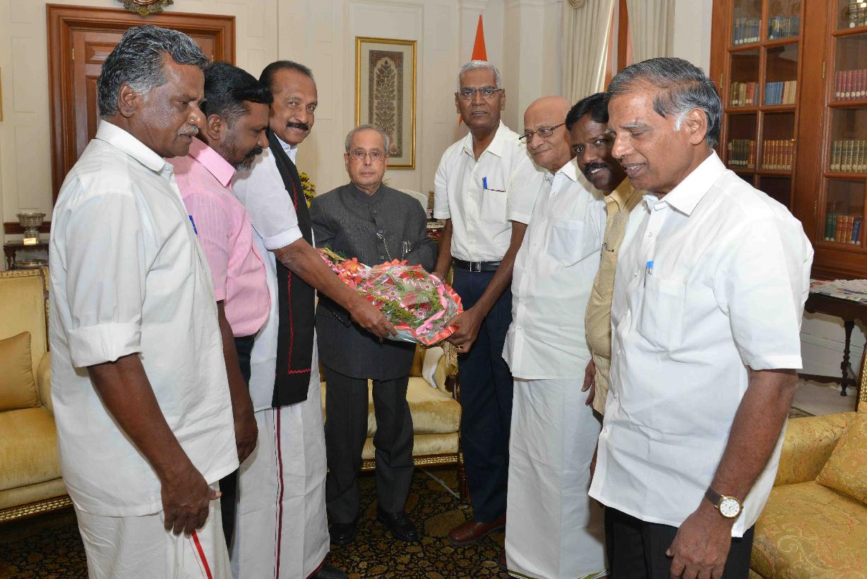 The President of India, Shri Pranab Mukherjee meeting with Shri D. Raja, MP (RS) alongwith an All Party Delegation from Tamal Nadu, at Rashtrapati Bhavan on October 21, 2016.