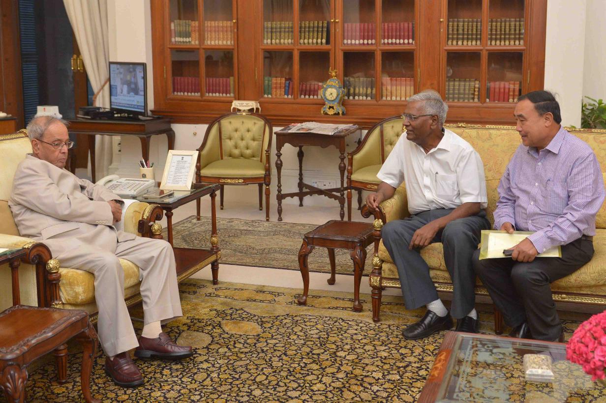 The President of India, Shri Pranab Mukherjee meeting with Shri D. Raja, MP (RS) alongwith Dr. Nara Singh, State Secretary, CPI, Manipur, at Rashtrapati Bhavan on May 30, 2016.