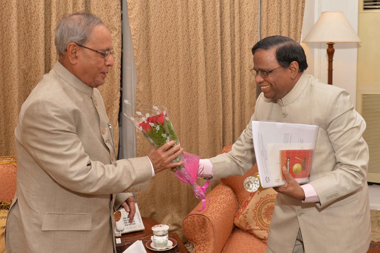 The President of India, Shri Pranab Mukherjee meeting with Prof. (Dr.) D. Swaminadhan, at Rashtrapati Nilayam, Bolarum, in Secunderabad on July 04, 2015.