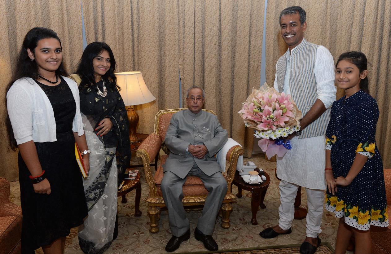 The President of India, Shri Pranab Mukherjee meeting with Shri Debashish Chatterjee alongwith his family members, at Rashtrapati Nilayam, Bolarum, in Secunderabad on December 28, 2016.