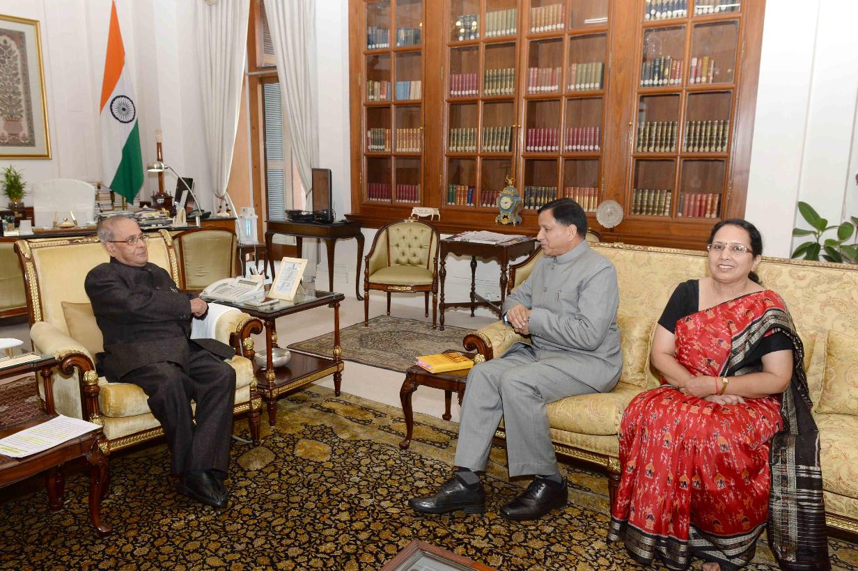 The President of India, Shri Pranab Mukherjee receiving a book ''The Indian Parliament, Beyond the Seal and Signature of Democracy'' from Shri Devender Singh, Additional Secretary, Lok Sabha Secretariat alongwith his wife, at Rashtrapati Bhavan on October 13, 2016.