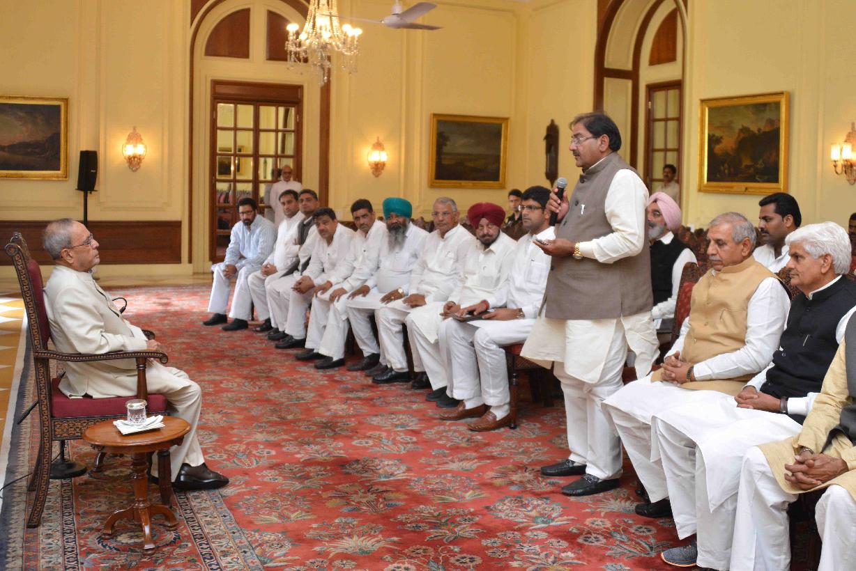 The President of India, Shri Pranab Mukherjee meeting with a delegation of MPs, MLAs and Leaders of Indian National Lok Dal from Haryana led by Shri Dushyant Chautala, MP (LS), at Rashtrapati Bhavan on March 19, 2016.