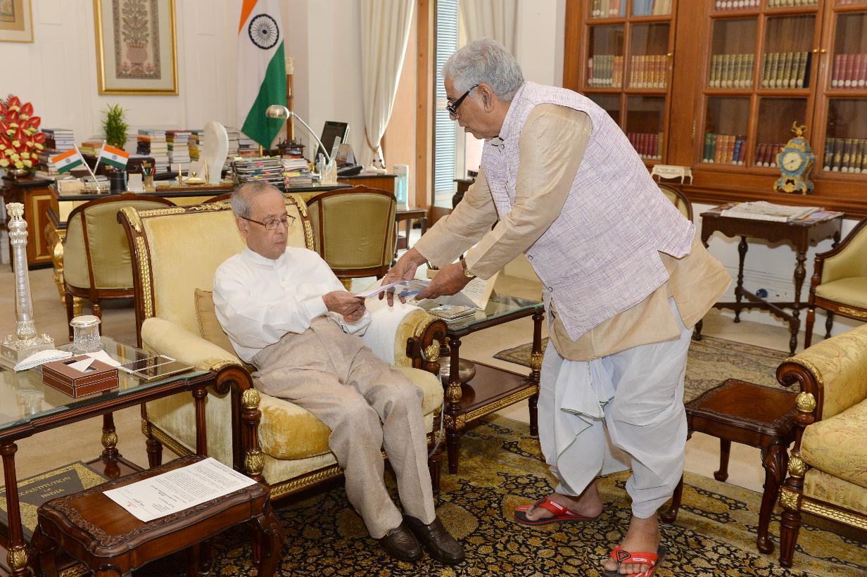 The President of India, Shri Pranab Mukherjee meeting with Shri Dwijaprasad Bhattacharya with others, at Rashtrapati Bhavan on March 31, 2016.