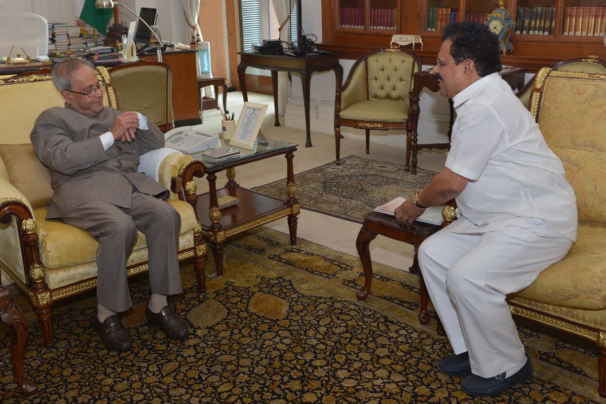 The President of India, Shri Pranab Mukherjee meeting with the MP (RS) and Chairman, Committee on Personnel, Public Grievances, Law & Justice, Dr. EMS Sudarsana Natchiappan, at Rashtrapati Bhavan, in New Delhi on June 09, 2015.