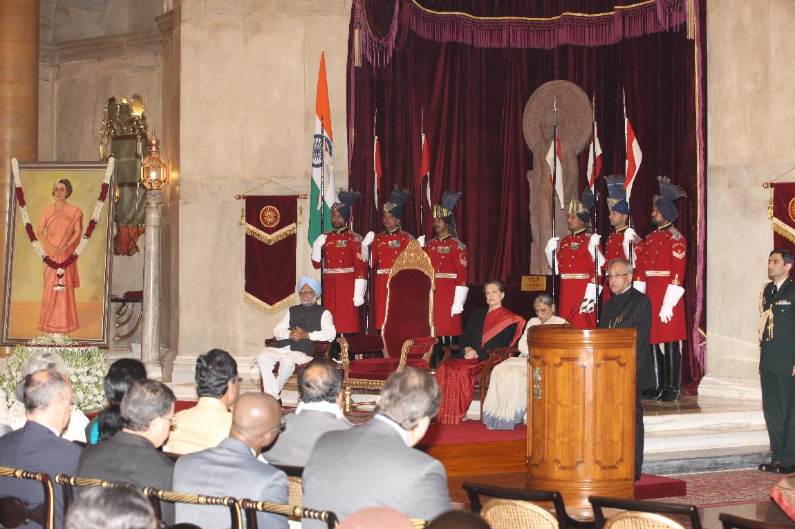 The President of India, Shri Pranab Mukherjee Presenting the Indira Gandhi Prize for Peace, Disarmament and Developement for 2011 to Ms Ela Ramesh Bhatt of SEWA on Feb 18, 2013