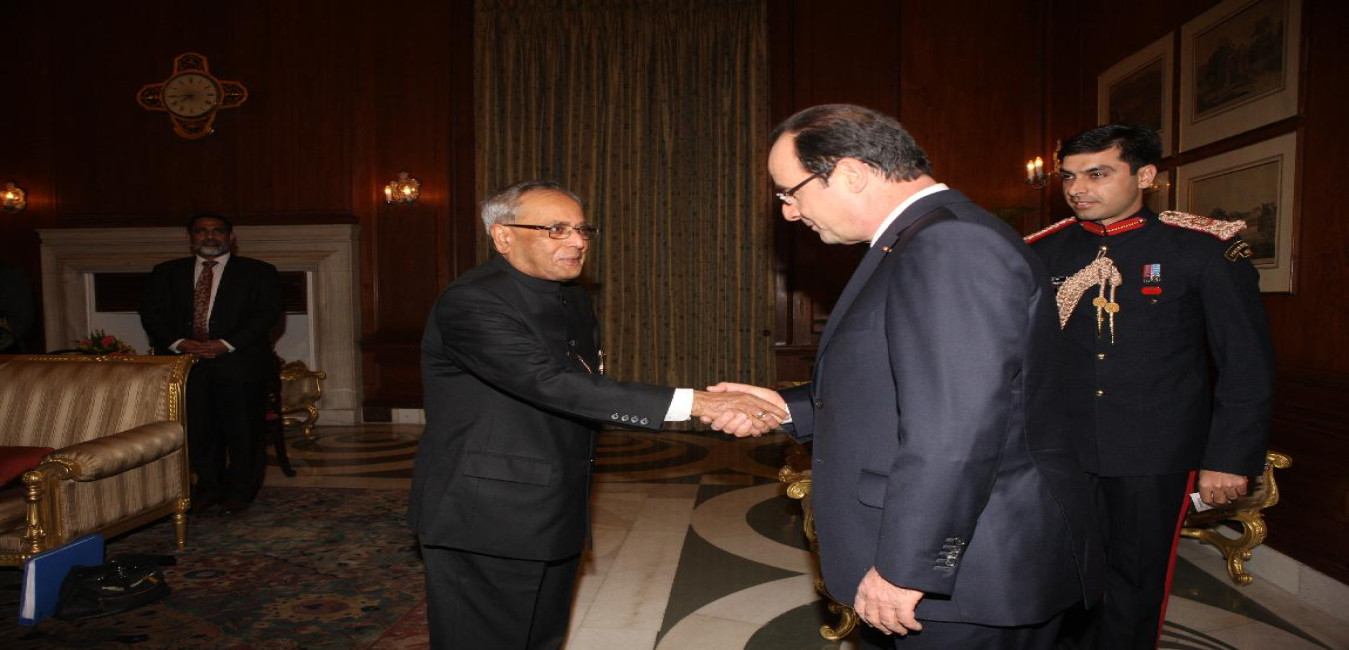 The President of India, Shri Pranab Mukherjee receives HE Mr Francois Hollande President of The Republic of France and Ms Valerie Trierweiler on February 14, 2013