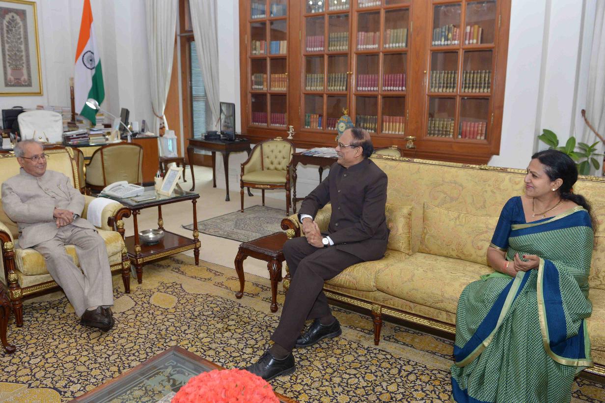 The President of India, Shri Pranab Mukherjee meeting with Shri G. Mohan Kumar, Defence Secretary and Dr. (Smt.) Geetha Mohan Kumar, at Rashtrapati Bhavan on May 22, 2017.