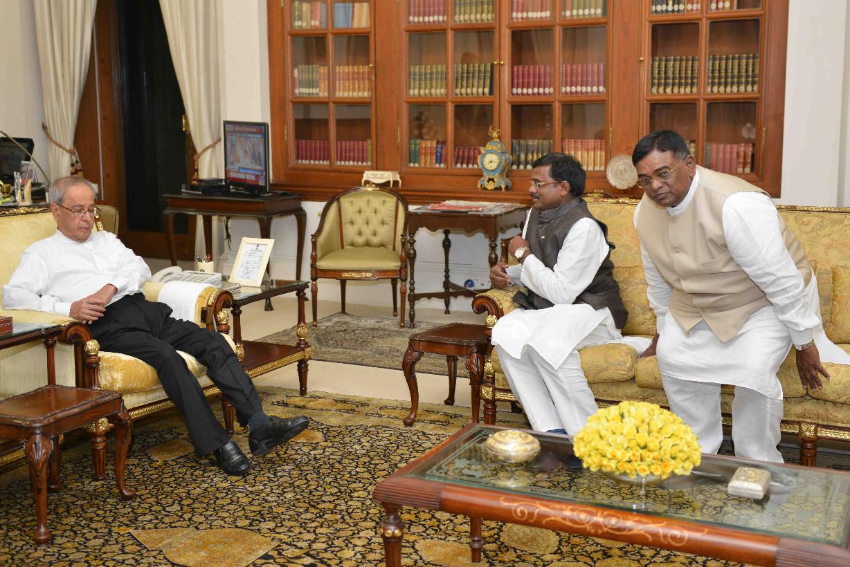 The President of India, Shri Pranab Mukherjee meeting with Dr. G. Vivekanand, Ex-MP (LS) and Shri G. Vinod from Hyderabad, at Rashtrapati Bhavan, in New Delhi on September 22, 2015.