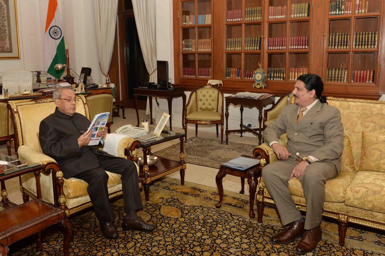 The President of India, Shri Pranab Mukherjee receiving a book '' Indian Maritime Strategy'' from Dr. GVR Shastri, Chairman, Coastal India Development Council, at Rashtrapati Bhavan on February 16, 2016.