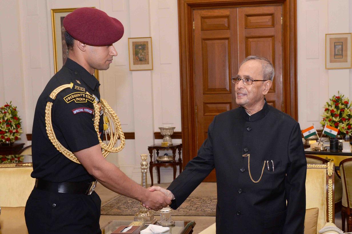 The President of India, Shri Pranab Mukherjee meeting with Capt. Gaurav Chaudhury, ADC to the President, at Rashtrapati Bhavan on March 10, 2016.