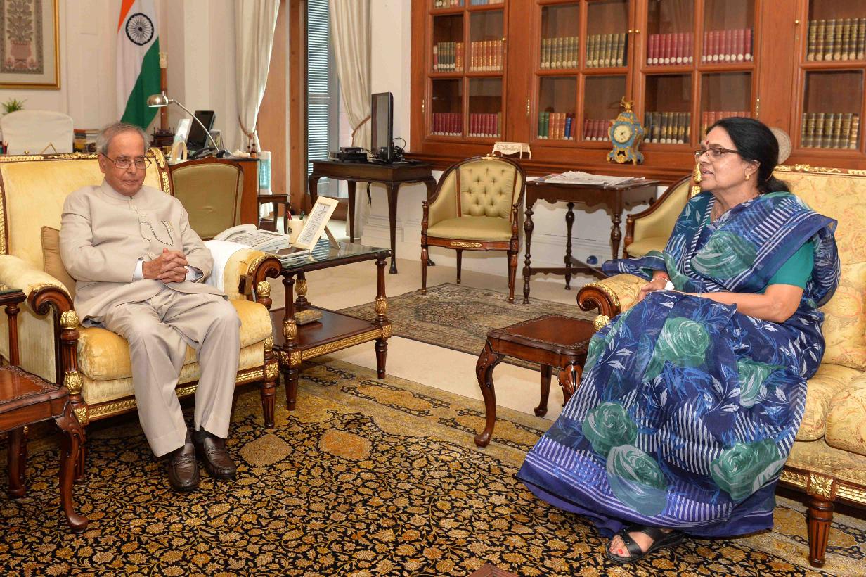 The President of India, Shri Pranab Mukherjee meeting with Dr. Girija Vyas, former Union Minister, at Rashtrapati Bhavan, in New Delhi on August 22, 2015.